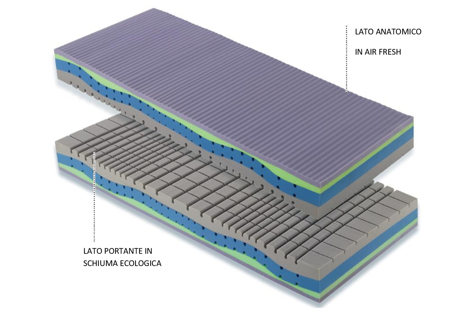 I quattro strati di colori diversi sono in schiuma a portanza differenziata ecologica denominata e registrata OLMOSOFF, un prodotto traspirante che ha caratteristiche decomprimenti (simile al memory) senza avere i difetti di traspirazione che il memory comporta. Tale materiale è infatti 200 volte più traspirante dei materiali convenzionali. Posto in superfice a contatto con il corpo, esso garantisce un supporto gradevole e fresco grazie alle capacità deumidificanti. Togliendo l’umidità in eccesso, offre una superficie più secca e più confortevole dal punto di vista termico.